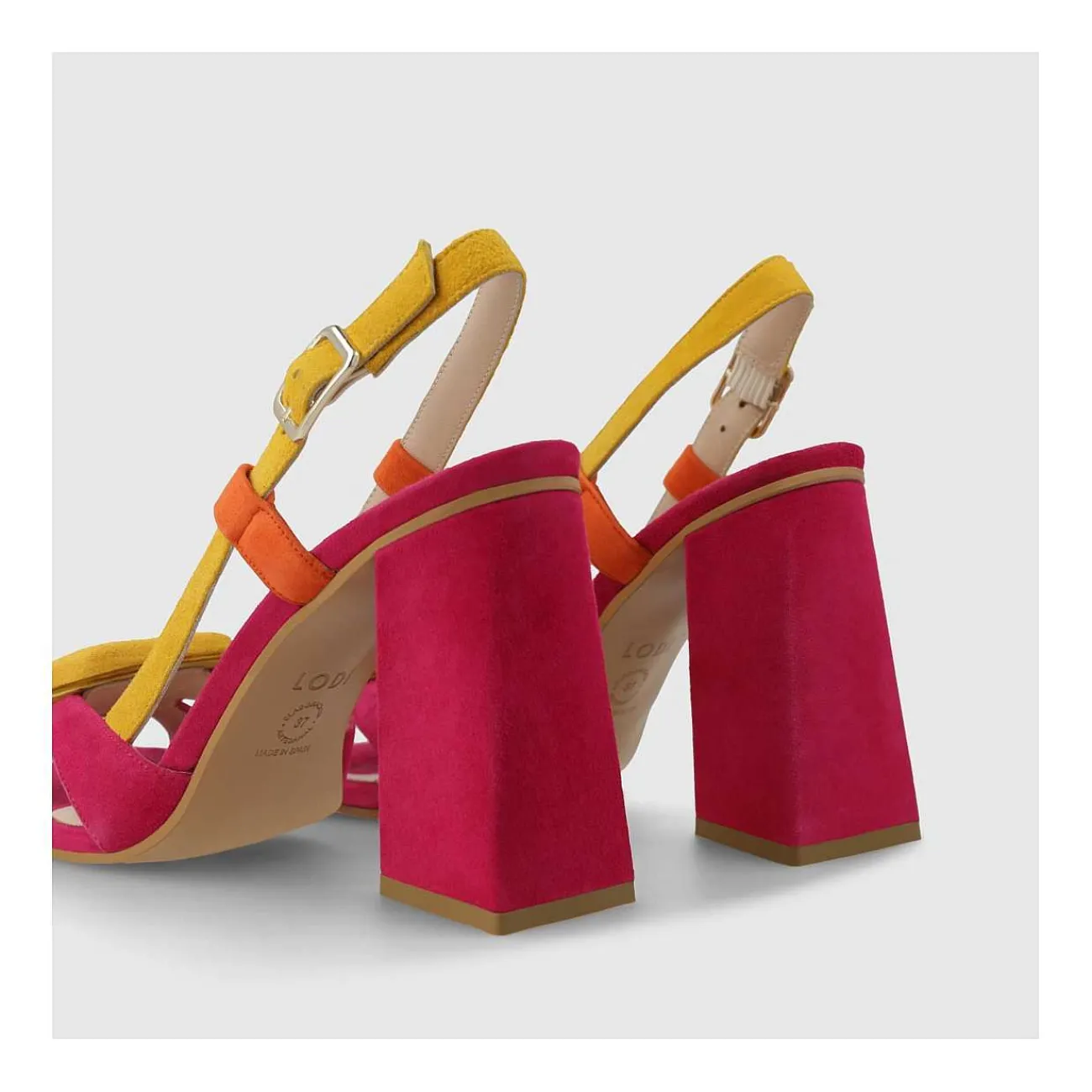 Sandalias De Mujer Yulini De Lodi En Ante Combinado En Color Fucsia Y Amarillo. Un Estiloso Diseño Ideal Para Tus Mejores Looks. Confeccionado Con Tacón Geométrico De 9.5 Cm De Altura. Detalle De Adorno Forrado En Ante Combinado Con Tiras. Punta Cuadrada. Incluye Planta New Gel Para Mayor Comodidad En Todas Tus Pisadas. Fabricado En España.